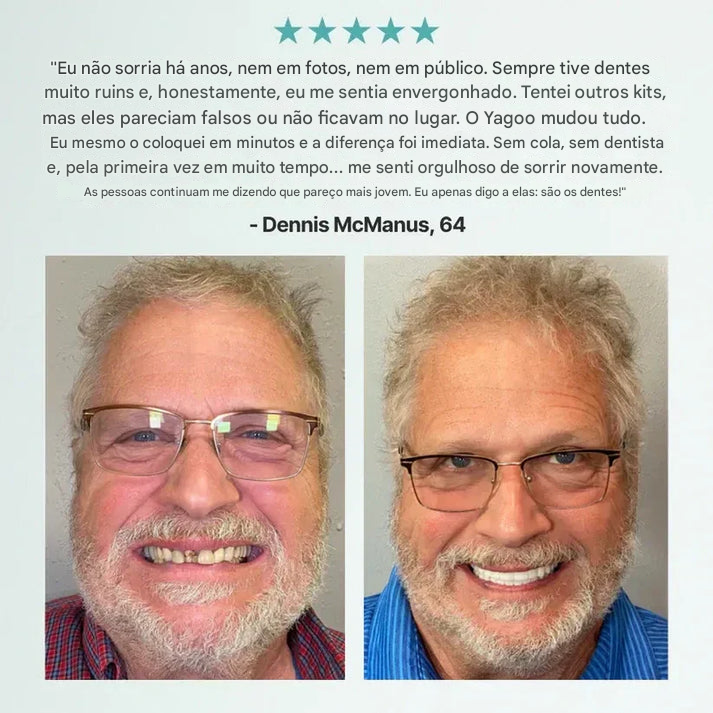 "Estou extremamente feliz com minha nova prótese dentária Yagoo™! Antes, eu me sentia insegura e meus dentes antigos me faziam parecer mais velha. Agora, pareço mais jovem, me sinto confiante e finalmente posso aproveitar a comida novamente. O encaixe é perfeito e a sensação é muito natural!"